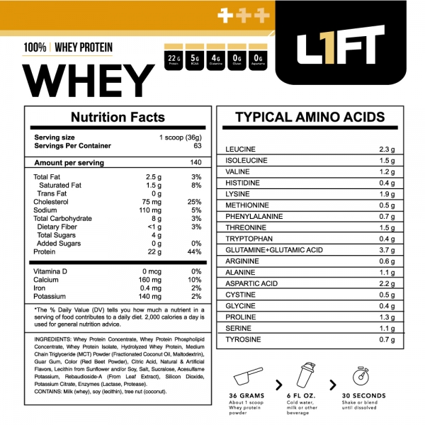 Whey de L1FT eleva el rendimiento físico y acelera la recuperación tras el ejercicio. Desarrollada y elaborada en Estados Unidos bajo estrictos estándares científicos, esta fórmula ofrece resultados visibles para deportistas que entrenan con enfoque en objetivos y disciplina. Promueve el desarrollo muscular sostenido, mejora la definición corporal y mantiene el equilibrio metabólico. Su absorción eficiente brinda energía real sin molestias digestivas.